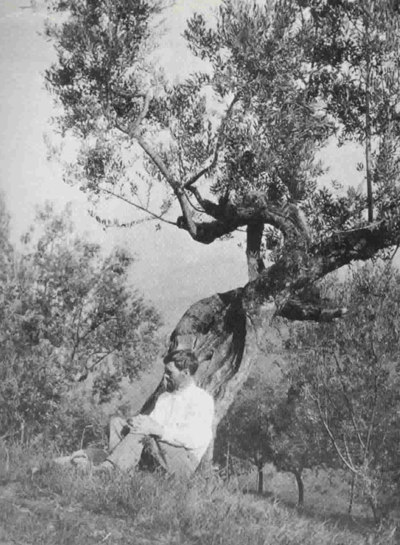sotto un albero: D H Lawrence under an olive tree somewhere in Italy, me under a mighty conifer in Deloraine, Tasmania. Both of us blogging, or not blogging, or imagining what it would be like to be blogging. What connects us is not writing, but the olive tree. Most of this blog will be written surrounded by olive groves.