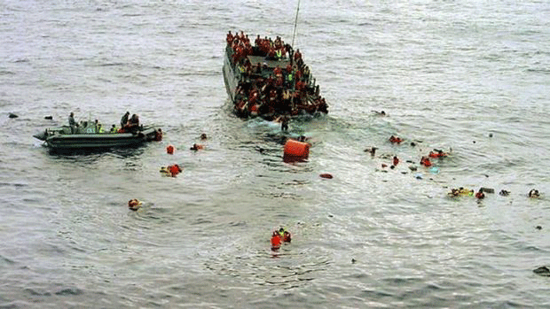 Che non sarebbe successo in Australia. In Australia non ci sono rifugiati disperati in cerca di aiuto, ci sono solo immigranti ‘illegali’ che minacciano la nostra sovranità, «boat people» che cercano di intimidirci. Nel caso più famoso d’intimidazione, gli immigranti hanno gettato i loro figli a mare in modo che la marina li avrebbe soccorsi e portali in Australia. ‘Non voglio persone come quelli nel nostro paese!’, ha gridato il premio ministro, John Howard, e la maggioranza dei australiani era d’accordo.