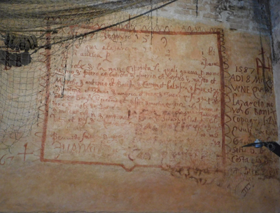 Now I am wondering – what if my Venetian priest, Domenico Pasqualigo, is also writing a ‘blog’, a fifteenth century ‘blog’? He might write in a wavering hand on sheets of thin paper, or he might scrawl on the walls of his tiny cell. Writing on the walls of the buildings was typical. Some of it is still there, centuries later, recording the ships, the dates, the numbers.